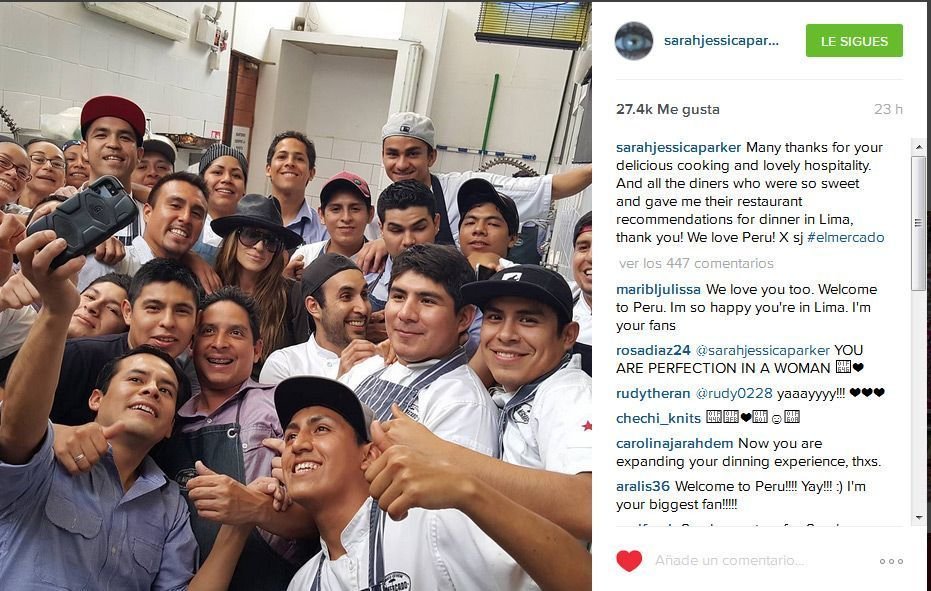 Ella disfrutó de nuestra gastronomía en el conocido restaurante del chef Rafael Osterling, “El Mercado”, donde al finalizar su visita se tomó una foto con todo el personal de cocina y agradeció en su cuenta por la buena comida y la hospitalidad. También pudimos ver fotos con su staff en el barrio de Barranco.
